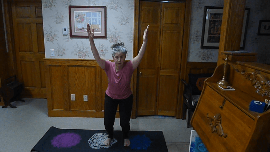 Anytime you raise your hands over your head, balance will be harder to find. Before you raise your hands, make sure you’ve built that firm foundation and really grounded into your mat. Bring your hands to your hips before raising them over your head.